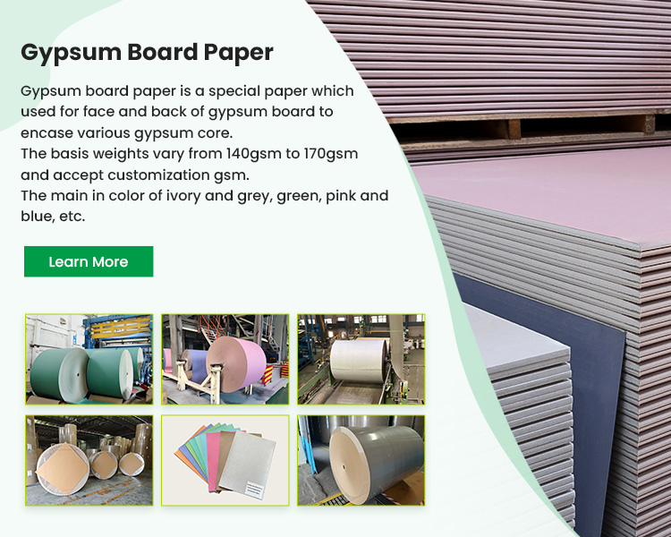 The other main product is the gypsum board paper which are mainly used for producing gypsum board, Our gypsum paper main in ivory and grey, green, pink and blue. The general weights vary from 140gsm to 170gsm and accept customization gsm.