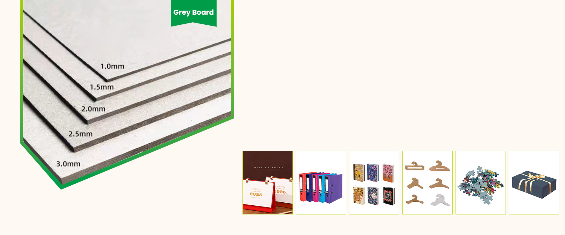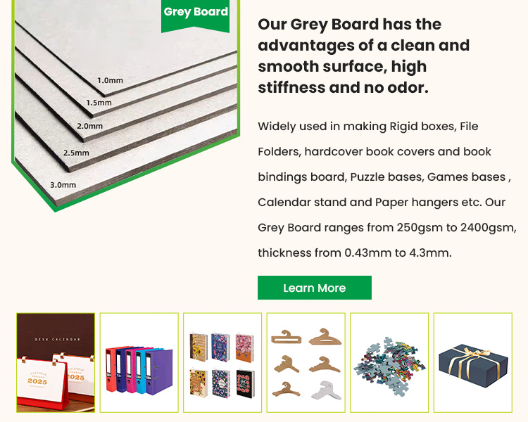 Our main product is the highest quality grey board from 250gsm to 2400gsm, thickness from 0.43mm to 4.3mm, the main application is making rigid box, stationary, book covers, paper hangers, etc.